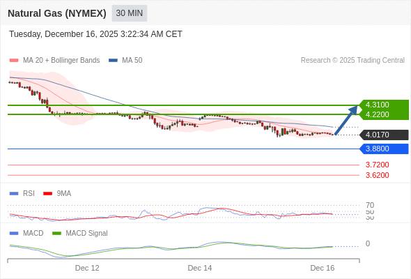 备选策略: 如跌破 3.8800 ,Natural Gas (NYMEX) (JAN6) 目标方向定在 3.7200 和 3.6200 。